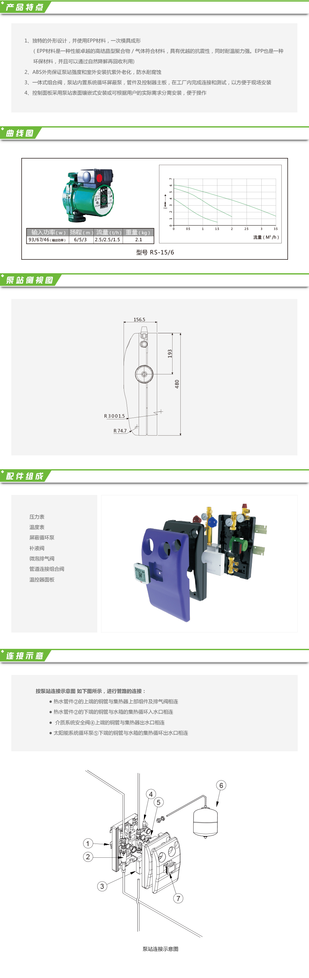 獨特的外形設計,使用EPP材料,一次模具成形,一體式組合閥,泵站內置系統循環屏蔽泵。控制面板采用泵站表面鑲嵌式安裝或可根據用戶的實際需求分離安裝,便于操作。