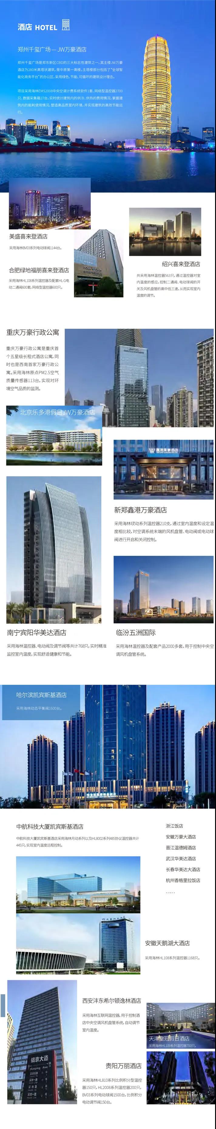海林節能憑借在國內暖通自控領域21年的探索和引領,以及先進的技術和優質的產品,成為國內眾多酒店項目暖通自控設備供應商,為酒店舒適健康和節能環境提供智能控制。
