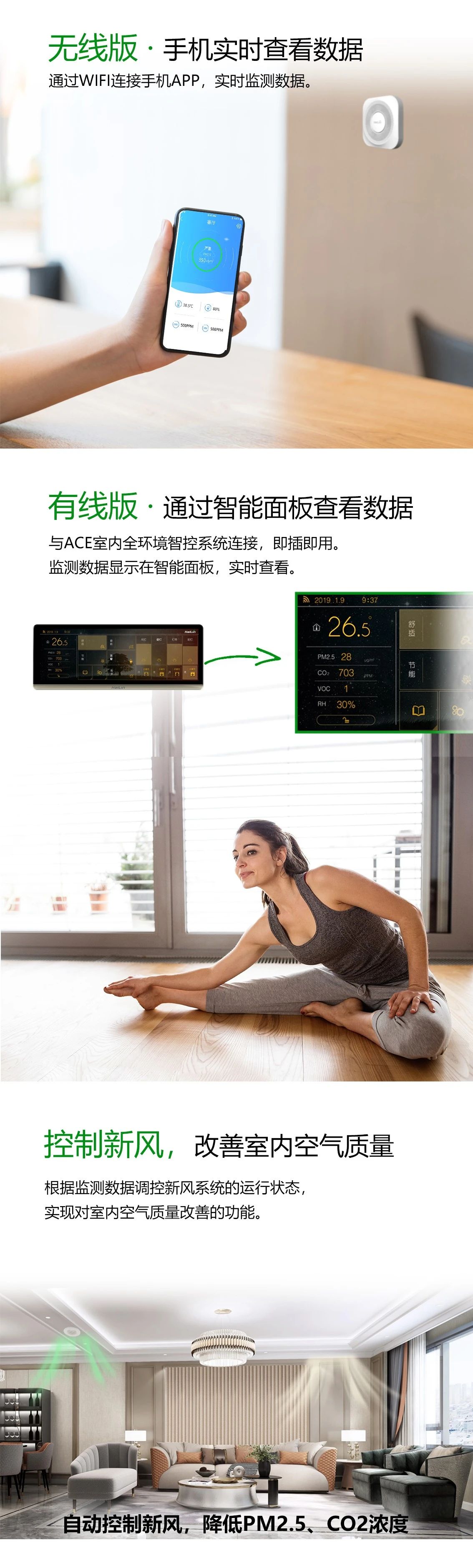 集 PM2.5、TVOC、CO? 、溫度、濕度的監(jiān)測功能于一體,實時精準監(jiān)測,數據一目了然