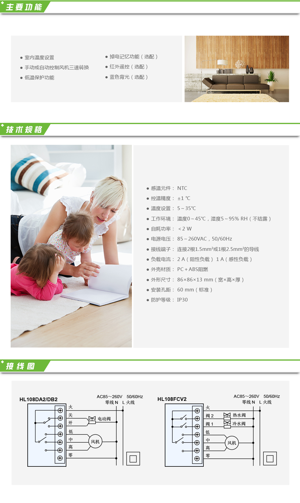 HL108系列室內溫控器適用于家庭、辦公樓、寫字樓、學校等場所的溫度控制。用于控制風機盤管(和電動閥),通過按鍵可選擇制熱、制冷或通風功能。