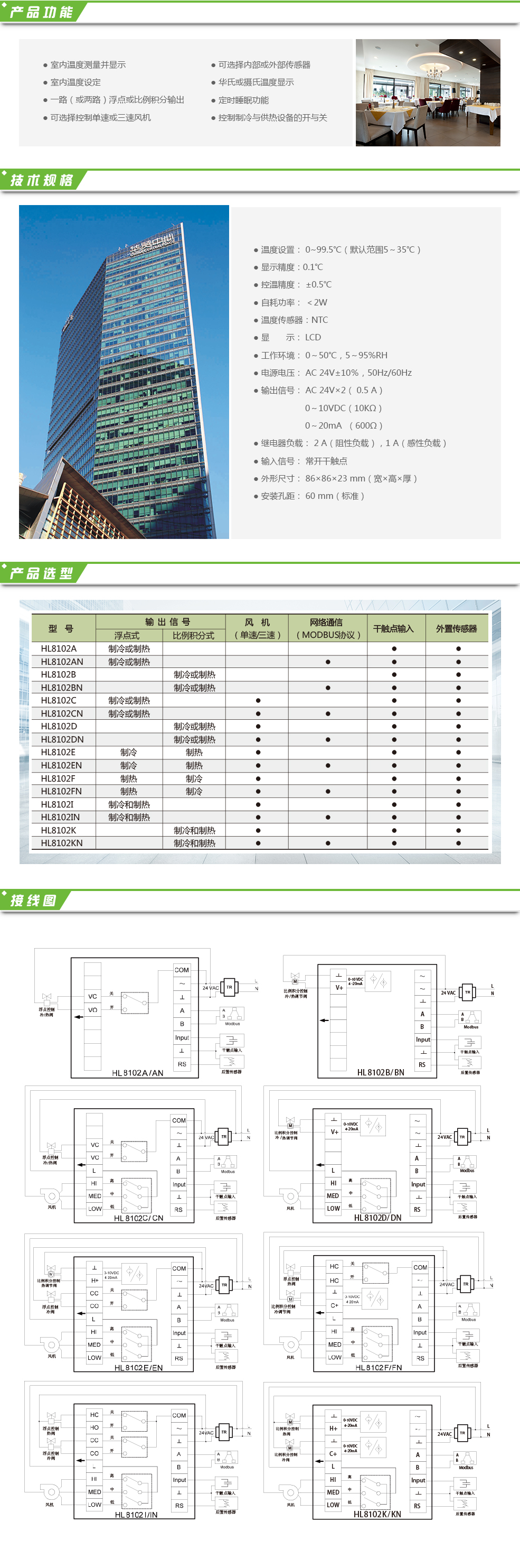 比例積分型溫控器HL8102用于家庭、辦公樓、寫字樓、學校等場所的溫度控制,適用于控制信號為DC 0-10V(或0-20 mA)及浮點控制的電動調節閥及變風量系統中的風門執行器,并能選擇控制單速或三速風機,具有網絡控制功能(N型,MODBUS協議)。
