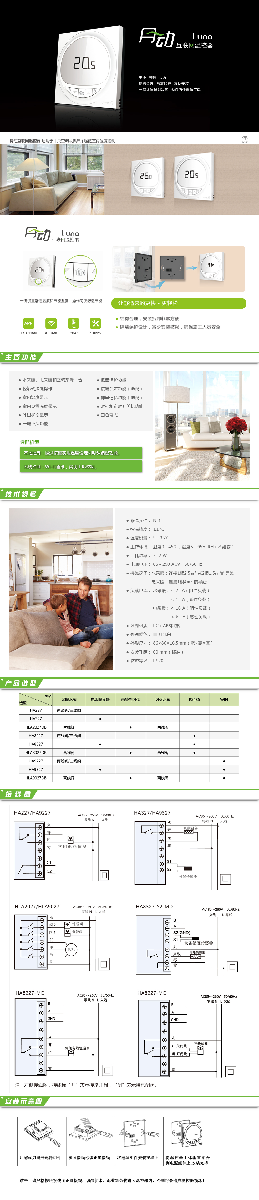 月動采暖溫控器包括“本地控制、有線控制、無線控制”三種類型,適用于家庭地板采暖系統或散熱器采暖系統的室內溫度控制。外觀干凈整潔大方,結構合理極易拆裝。人性化隔離保護設計防止安裝破損,保證施工人員安全。采暖型產品一鍵設置舒適溫度和節能溫度,極大方便用戶的操作使用。